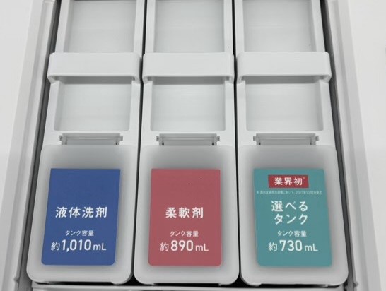 パナソニック『NA-LX129E』『NA-LX127E』には、液体洗剤用タンク・柔軟剤用タンク・選べるタンクの3つのタンクが搭載されています。